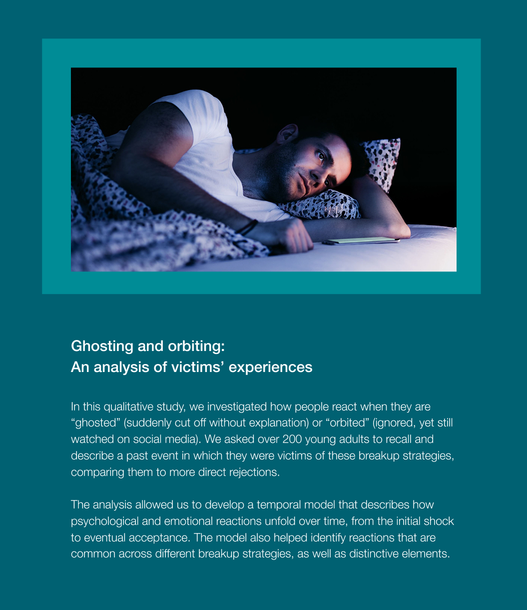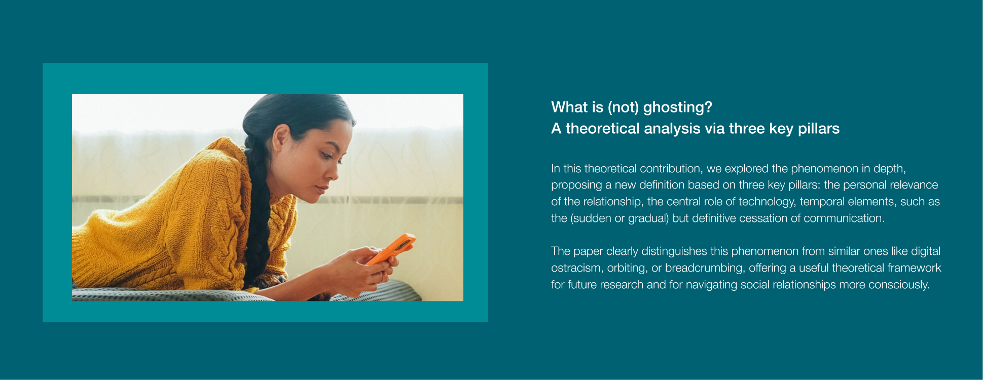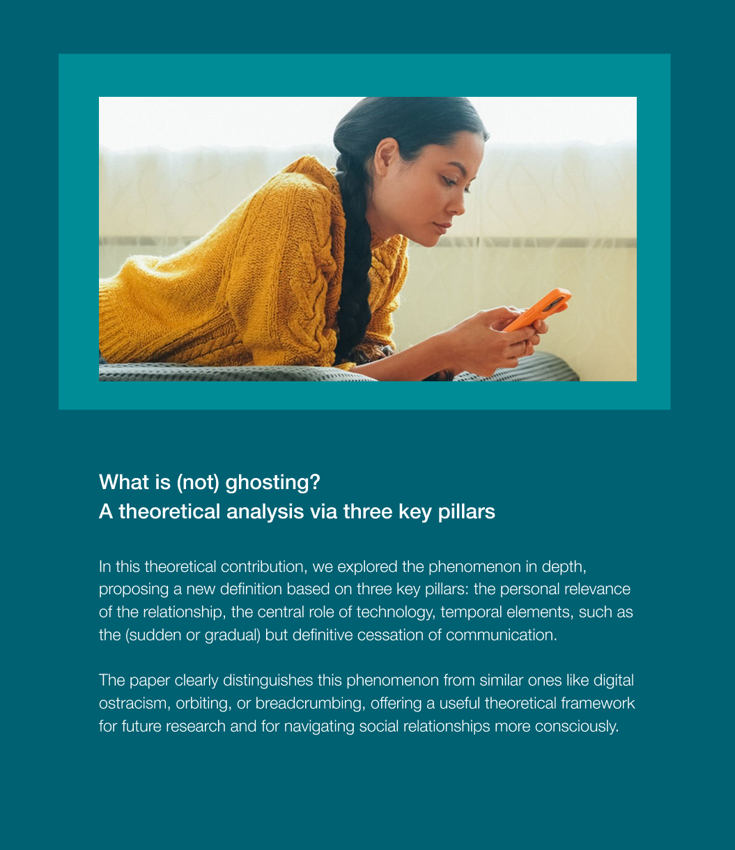 We are particularly committed to investigating online interactions through social media, deepening our understanding of well-known phenomena such as phubbing and ghosting through innovative methods, and exploring emerging forms of interaction involving virtual reality and artificial intelligence technologies.
