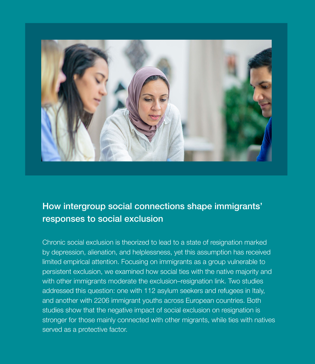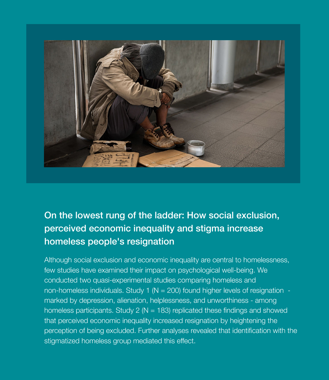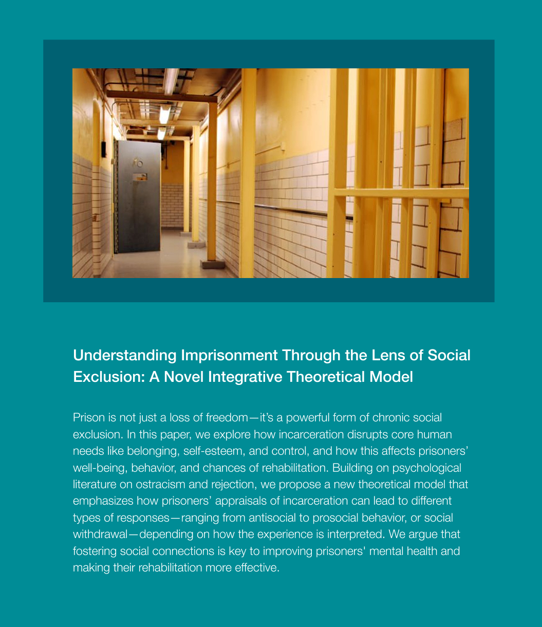 A key focus is the long-term effects of exclusion in marginalized groups, including migrants, individuals experiencing homelessness, and prisoners, to understand how social disconnection shapes their lives. We also study the coping mechanisms and resilience strategies that can help mitigate the negative effects of exclusion and foster social reintegration.