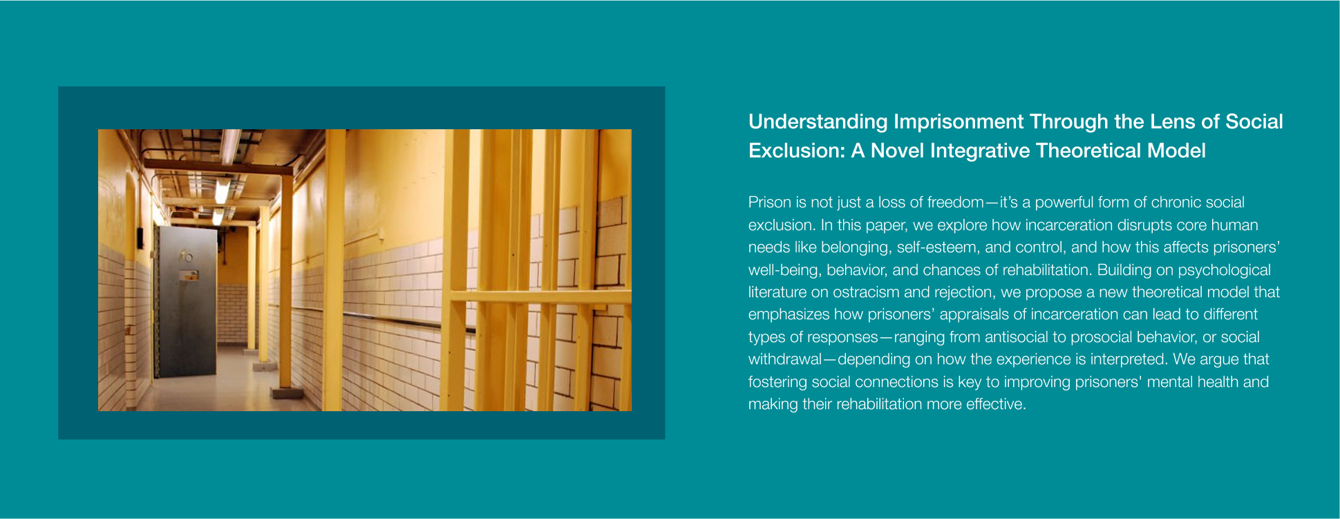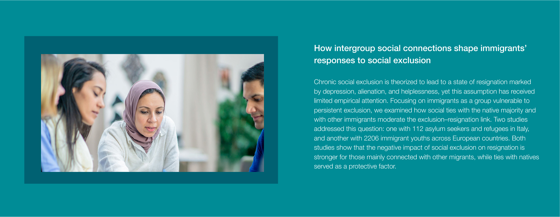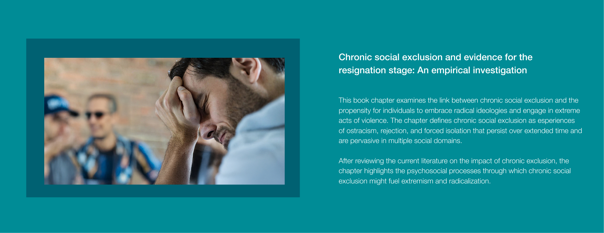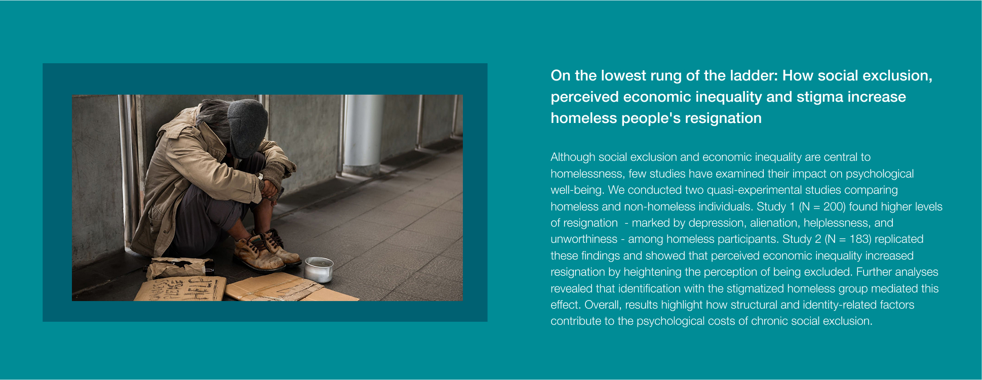 A key focus is the long-term effects of exclusion in marginalized groups, including migrants, individuals experiencing homelessness, and prisoners, to understand how social disconnection shapes their lives. We also study the coping mechanisms and resilience strategies that can help mitigate the negative effects of exclusion and foster social reintegration.