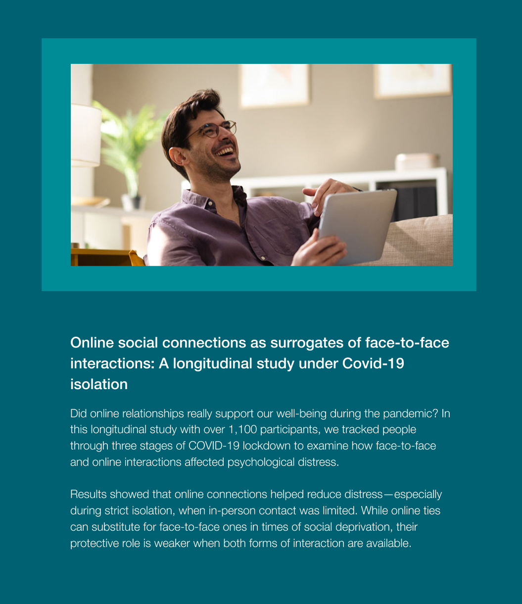 At ConnectLAB, we study the psychological and social impact of digital technologies. Or research focus on their role in fostering meaningful connections as well as in shaping experiences of exclusion.